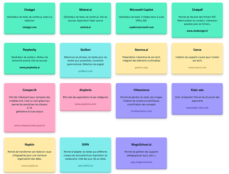 Comme dans mon Padlet, et le Netboard lecture/écriture, j'ai choisi uniquement quelques applis IA, la liste est loin d’être exhaustive, mais pour ce qui veulent plus d’appli en fonction des besoins un site est donné dans l'onglet répertoire IA.